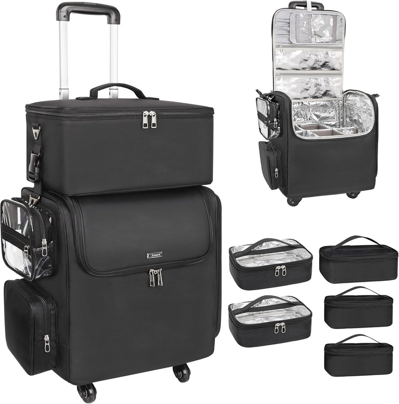Large Makeup Train Case,Cosmetic Makeup Case for Hairstylist, Hairdresser Bag with Detachable Pouch,Heat Insulation and Anti-scalding Full layer for Hairdressing Tool Organizer Trolley with wheels Multi-functional - This all-in-one Makeup...