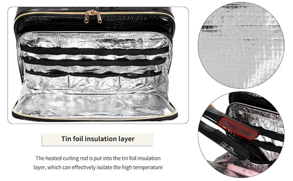 There is a thermal insulation layer of tin foil on the front of the large makeup organizer case When you have finished using the curling iron and have not cooled down, you can put it inside, which can well isolate the temperature inside, so that you don’t have to wait or put it in an emergency. Fear of scalding the fabric in the inner layer.