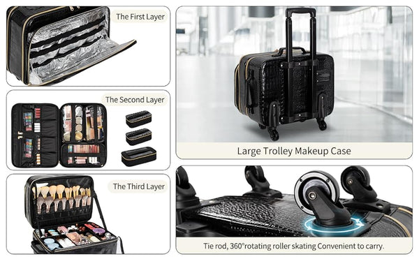 The rolling makeup artist travel case has the capacity of an extra-large makeup case, which can meet the needs of a professional makeup artist. There are three Layer for your makeup accessories, and a large pocket on the front has an insulation layer for hot curling irons.